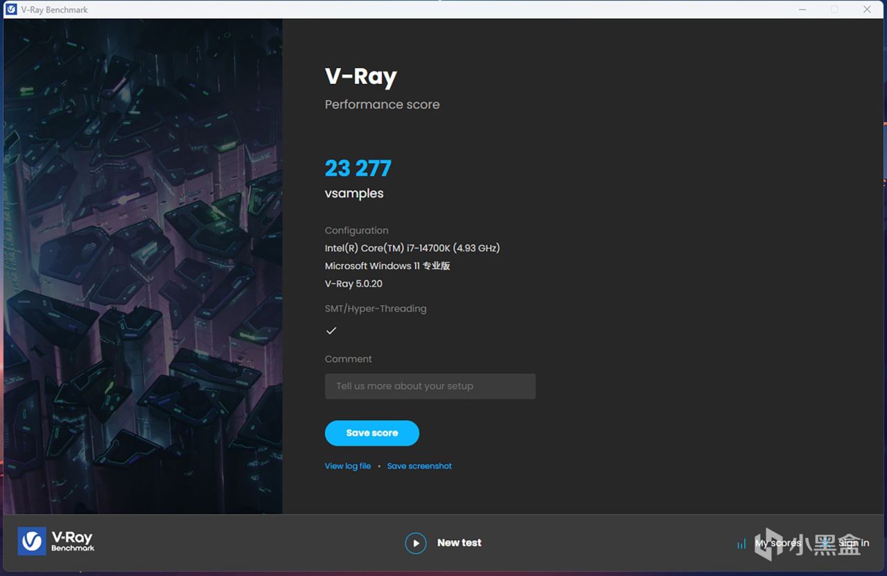 V-Ray benchmark软件提供了三个测试项目,可以分别在GPU和CPU上进行渲染测试。但是,两个GPU测试项目需要NVIDIA的显卡,因此这次只测试处理器的计算渲染。这款第14代英特尔酷睿i7-14700K处理器的得分为23277分。