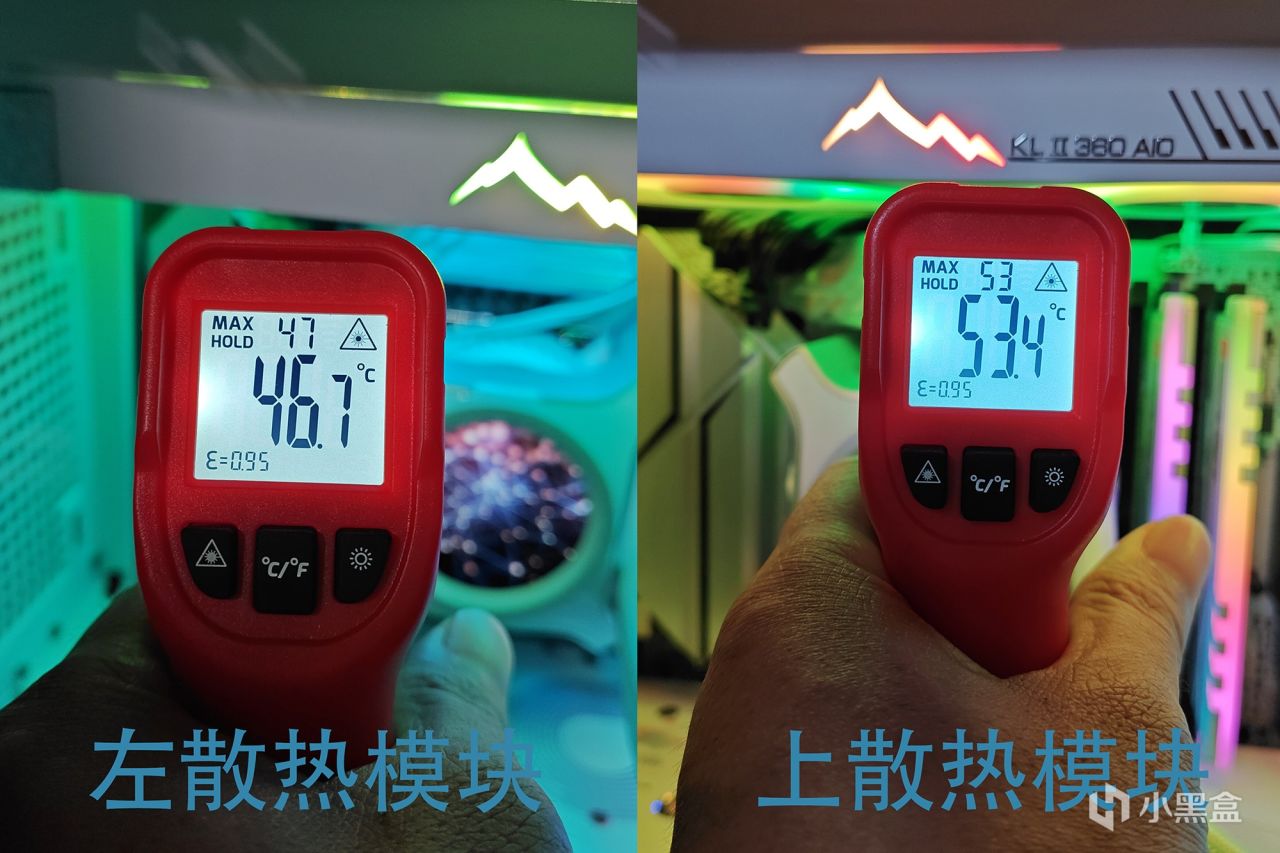 主板的电源模块可能没有配备温度传感器,并且在测试软件中没有找到相应的值,因此只能通过红外温度计测量散热模块的温度。当处理器满载时,左侧和上部散热模块的表面温度分别为46.7℃和53.4℃,主要是因为水冷散热器的水冷头内置风扇辅助散热,降低了电源模块的温度。