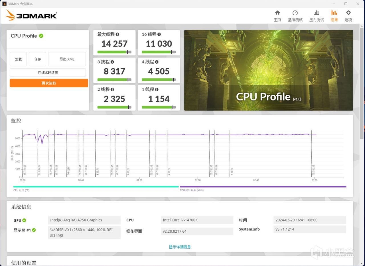 3DMark benchmark软件中的CPU Profile项目主要测试处理器在不同线程数下的性能。英特尔酷睿i7-14700K处理器的最大线程得分为14257,16线程得分为11030,2线程得分为2325,单线程得分为1154。