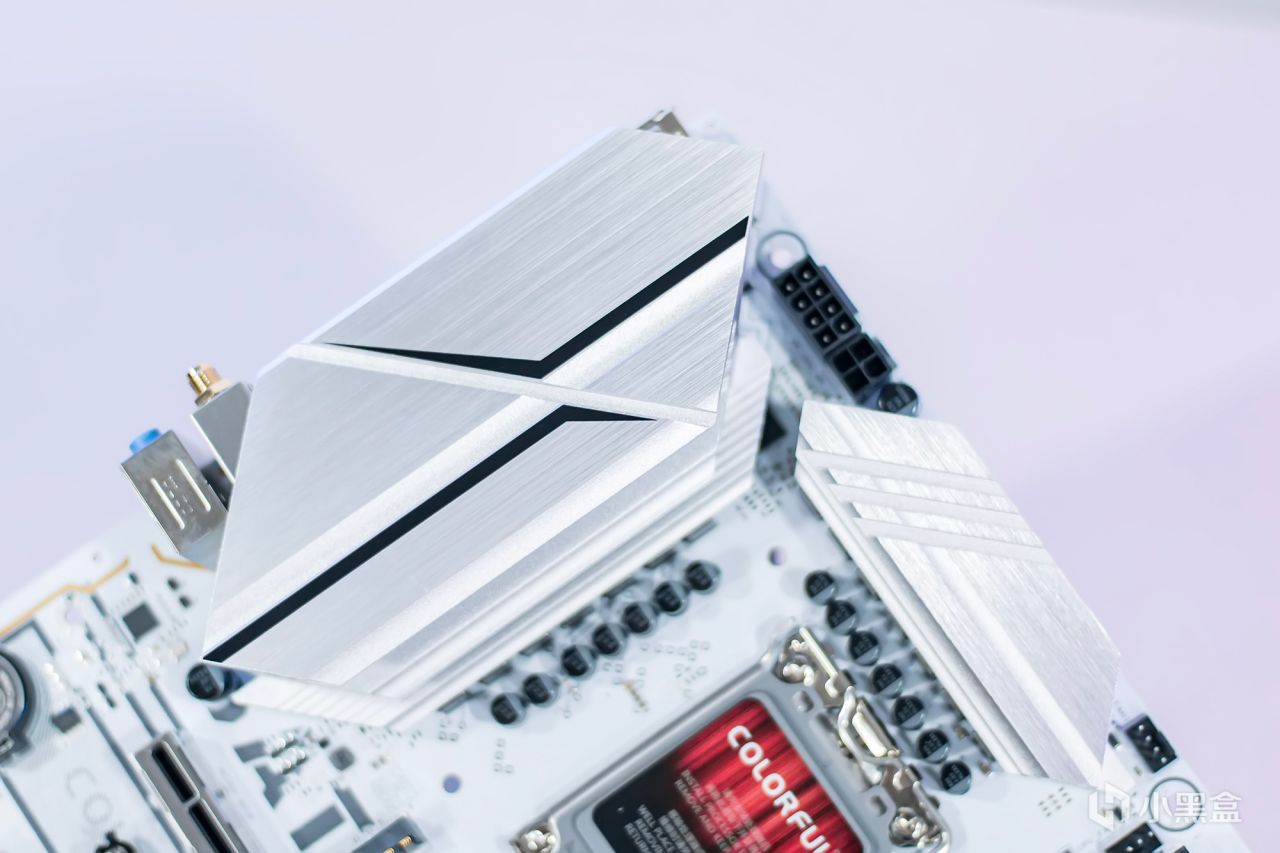 电源模块负责给处理器供电,同时也是发热大户,必须配备足够的散热模块。多彩BATTLE-AX B760M-WHITE WIFI V20主板配备了相当厚的铝合金散热模块,其表面经过拉丝金属技术处理,并具有战斧图像凹槽设计。此外,主板背面的I/O接口盖板在出厂时没有安装在一起。