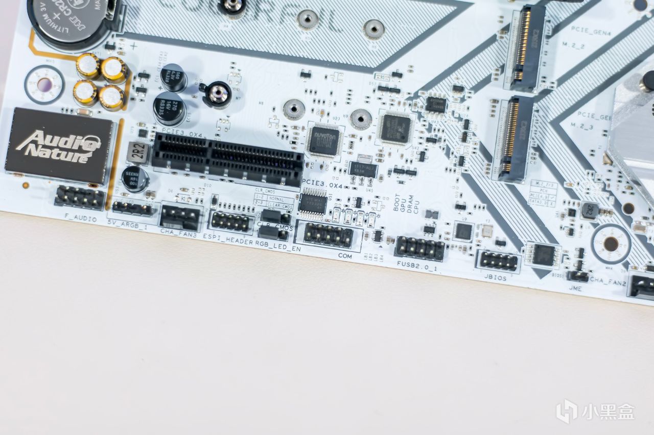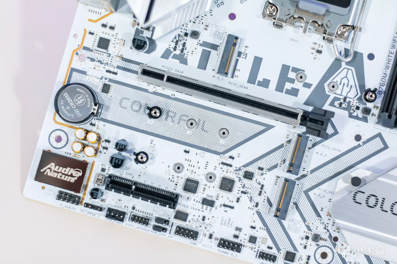 炫彩BATTLE-AX B760M-WHITE WIFI V20主板配备了一个PCIe5.0 x16全尺寸显卡插槽,插槽外部完全由金属加固物包裹,有效提高了整体稳定性和使用寿命。下方还有一个PCIe3.0 x4插槽,可以适当搭配M.2适配卡等配件,增加固态硬盘的插槽,充分利用主板的传输带宽。