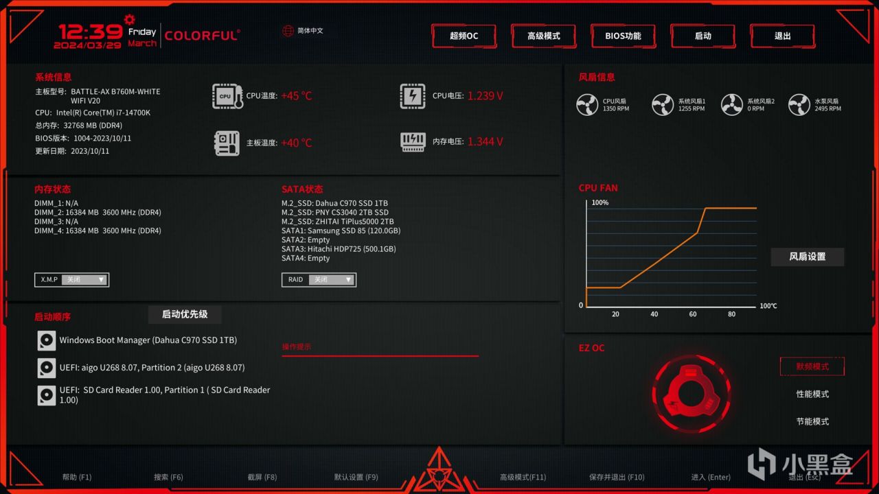 开机需要进入BIOS进行相应的设置。这一次,它是在BIOS的1004版本中测试的。新版BIOS与第14代处理器兼容。整个BIOS界面仍然采用了多彩的设计风格。在主界面中,可以查看存储芯片、处理器、硬盘和散热风扇等设备的状态,为用户提供静音模式、性能模式和节能模式,以便快速切换。