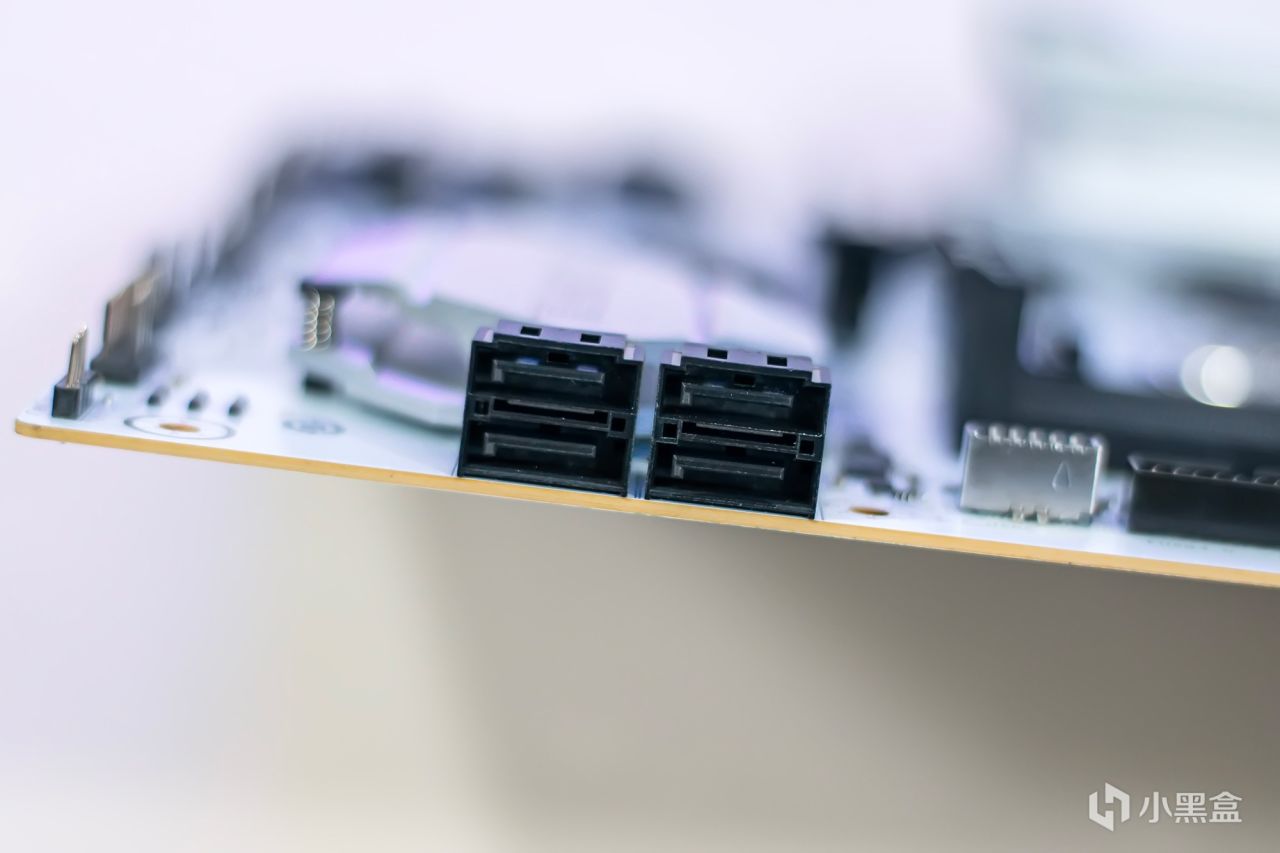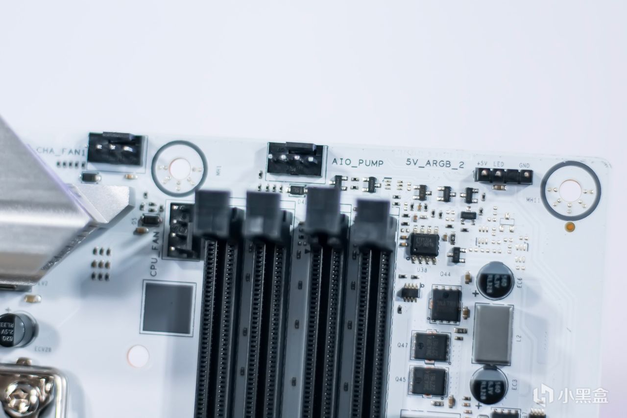 位于内存插槽的上侧,它还提供了一组5V ARGB灯效果接口和三组4Pin冷却风扇电源接口,即使使用水冷散热器也足够了,使其更容易安装和使用,而无需专门布线到主板的下侧。内存模块的右侧提供了一个USB 3.2第1代A型前可扩展插槽和一个USB 3.2第1代C型前可扩展插槽。