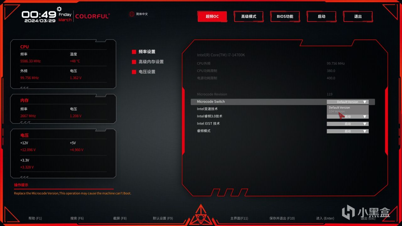 这款14700K处理器的满载功耗相当高,B760主板的默认电压较高,因此很容易因高温而被迫以较低的频率运行。主板BIOS中加入了微码切换,支持104微码模式,主要用于适当降低处理器的核心电压,解决处理器默认核心电压高导致满载温度高的问题。
