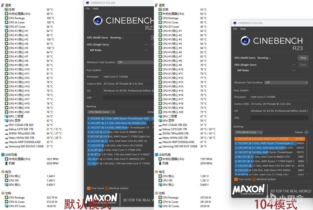 默认微码模式下的内核电压相当高。比如这款i7-14700K处理器满载电压达到1.35V,导致满载功耗飙升至332W,核心温度达到100℃,直接触碰温度墙降频。开启104微码后,满载核心电压降至1.29V,功耗也降至307W,核心温度也在不降频的情况下下降。