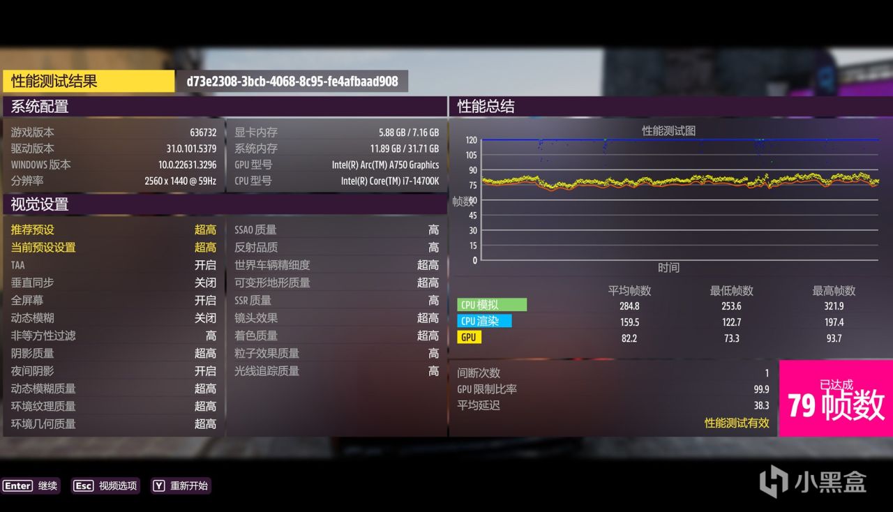 接下来进行游戏的实际性能测试,首先运行游戏《极限竞速:地平线5》。由于A750显卡仅配备8GB显存,如果将其设置为最高预设图像质量,显存占用将过高。因此,这一次,游戏屏幕被设置为预设的2K分辨率超高图像质量,打开TAA抗锯齿效果并关闭XeSS功能,实测平均游戏帧率达到79FPS。