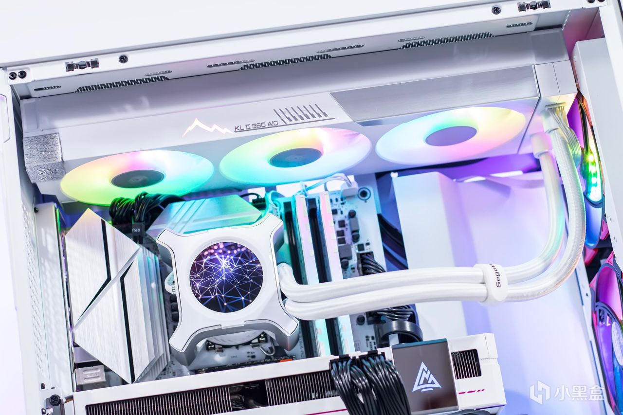 为了抑制14700K处理器的热量,不受热量的影响,使用了新谷昆仑第二代360水冷散热器,该散热器采用纯白外观和一体式散热风扇设计,并配备了2.1英寸液晶屏,可显示处理器的运行状态和视频图片。标称散热功耗为320W,可以满足旗舰处理器的散热需求。