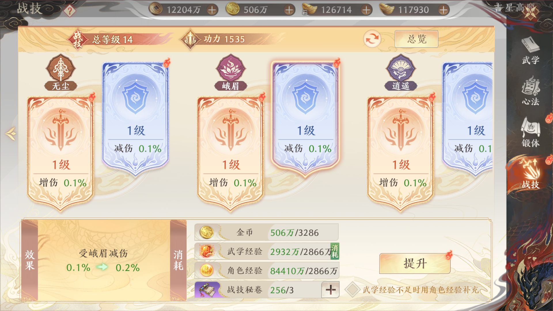 消耗金币、武学经验、角色经验、战术秘籍卷可以升级战术技能,从而获得特殊属性加成。